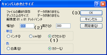 ● キャンバスを用意しよう ● 皆さんは Windows(ウインドウズ)を使っていますよね。 ウインドウズには「ペイント」というソフトが入っています。 この「ペイント」を使って、簡単な絵を描いてみましょう。 まずはペイントを起動します。ペイントは「スタート」→ 「すべてのプログラム」→「アクセサリー」にあります。 ペイントのソフトを立ち上げたら、窓枠(ウインドウ)の中に、白い部分が ありますよね。これがキャンバス。この中に絵を描きます。(グレーのところ は何も描けません) ウインドウの枠の端をドラッグするか、または最大化するなどして、ウイン ドウのサイズを少し大きめに調整したほうがいいかもしれません。 さて、白い部分(キャンバス)も任意の大きさに変更できます。 まず最初にやることは、どれくらいの大きさの絵を描くか、を決めなくては いけませんね。 では、まずはじめに、この白いキャンバスの大きさを変更してみましょう。 「 Ctrl 」 キーを押しながら「 E 」キー押します。 (または、ウインドウ上部のメニューバーから操作する場合は「変形(I)」 →「キャンバスの色とサイズ(A)」をクリックします) 幅(W)と高さ(H)を設定する入力画面が出ましたね。 ★画像説明(ここをクリック)★ 単位はインチ(I)、センチ(M)、ピクセル(P)から選べます。(1) 今回はとりあえず、幅 300 ピクセル、高さ 300 ピクセル(2) に設定してみ ましょう。入力が済んだら「OK」ボタン(3) をクリック、または「 Enter 」 キーを押してください。 これでキャンバスのサイズの変更ができました。 |