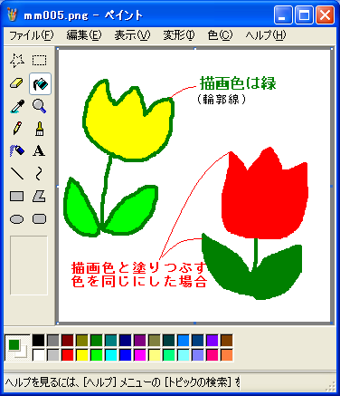 ● フリーハンドで描き、色を塗る ● 「スタート」→「すべてのプログラム」→「アクセサリー」でペイントを立 ち上げます。 XPの場合、よく使用するプログラムのショートカットは、スタートメニュー の中に自動的に表示されるようになります。 さて、今回はいよいよお絵描きをやってみます。 では、ツールボックスから「ブラシ」を選択し、キャンバス上でドラッグし ながら好きな絵を描いてみましょう。 ここで注意したいのは、あとで色を塗るときのために、輪郭線は必ず閉じる ようにしてください。少しでも途切れていると、そこから塗りつぶした色が外 へ飛び出してしまいます。 ★画像説明(ここをクリック)★ 輪郭線を描き終えたら、次に色を塗ります。 左側のツールボックスからペンキを垂らしたような絵、「塗りつぶし」を選 択します。 続いて下のカラーボックスから好みの色を選択します。このとき、カラーボ ックス左側の□の中の色が、選択した色に変わったことを確認してください。 ちょうど垂れた"ペンキの先端部分が、筆先"に当たります。輪郭線の内側に 持っていってクリックして一気に塗りつぶします。 元に戻したい場合は「 Ctrl 」+「 Z 」、でしたね。 輪郭線の色(描画色といいます)と内側の塗りつぶす色が同じ色の場合は、 輪郭線は消えてしまいます。 ★画像説明(ここをクリック)★ 輪郭線がある場合とない場合では、絵の雰囲気が変わります。そのときの状 況や、絵の雰囲気で使い分けてみましょう。 さて、いかがでしょうか?ここまで覚えたことで、ある程度のお絵描きがで きるようになります。どんどんいろんな絵を描いてみて、マウスの操作に慣れ てください。 |
