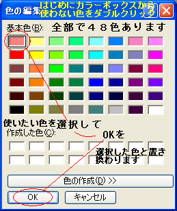 ● 色について学ぶ(1)絵本にみる色使い ● 今回の実践はちょっと趣を変えて、プロの絵を見てみることにしましょう。 ミッフィー公式サイト 作者 ディック・ブルーナ ↓ http://www.miffy.com/ メイシー(キャラクター・ボックス)作者 ルーシー・カズンズ ↓ http://homepage1.nifty.com/c-box/chara/chara/maisy.html 今、最も売れている絵本です。私も懐かしいです、これ。 瑞雲舎・ちびくろ・さんぼ 絵 フランク・ドビアス ↓ http://www.zuiunsya.com/news/chibikuro.html こどもの絵本は、乳児、幼児が絵本に対して興味や反応を示すように、とて も色が明るく鮮やかです。 赤、青、黄、緑、などといった基本的な色を使っていますね。 ペイントには、こういった基本色と呼ばれる色があらかじめ用意されていま すので、カラーボックス(パレット)に並べられた色だけでも十分絵本のよう な、鮮やかな絵を描くことができます。 もちろんほかの色を作成したり、明るさや鮮やかさを変えるなどということ もできますが、そのことについてはまた、あとの号で説明することにします。 ちなみにカラーボックスの、上下二段に並べられた色の数は28色です。 28色しかないわけではなくて、とりあえず手前に28色を並べているだけ です。実際は48色が用意されています。 br> では、その48色を見てみましょう。 ペイントを起動したら、カラーボックスには"黒"が選択されているはずです ので、どの色でもいいのですが、とりあえずそのカラーボックスの黒をダブル クリックしてみてください。 「色の編集」という画面が出ました。ここに48色ありましたね。 黒をダブルクリックしたため、現在も黒が選択された状態ですが、ためしに 左上のピンクをクリック(選択)してみましょう。 次に「OK」ボタンを押して「色の編集」ウインドウを閉じます。 カラーボックスの黒が、ピンクに置き換わりました。"置き換わる"というこ とに注意してください。 ★画像説明(ここをクリック)★ ペイントをいったん終了してしまうと、再び起動したときは、また元の状態 に戻ります。 さて、今回は「絵本にみる色使い」ということで、絵本はどんな色で表現し ているか、それと基本的な色、ペイントに最初から用意されている色の選び方 をやってみました。 どんな色で塗ろうか、色選びも楽しいものです。 |