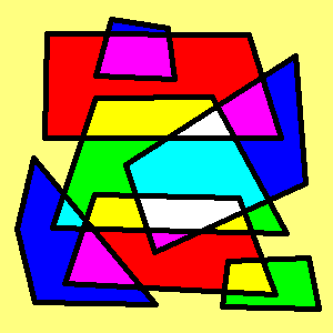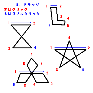 ● 多角形を描く ● 今回は多角形を描く方法です。まずは「台形」を描いてみましょう。 ペイントを起動します。 左側のツールボックスから「多角形」をクリックして選択します。マウスポ インタを当てると「多角形」と吹き出しが出るのがそうです。 さらにその下の方に、塗りつぶしのスタイルを選べるところがあります。 前回に説明した通り、ここは、また後の号で説明する予定でいますので、今 は現在選択されている状態(三つあるうちの一番上)のままにしておいてくだ さい。 それではいきます。 1)まずはじめは白いキャンバス内に、A から B へ、ドラッグしながら横線 を引きます。 ここでやはり「Shift」キーを使うと直線(斜めにドラッグすれば45度の線が、 下にドラッグすれば垂直の線)が描けます。 ★画像説明(ここをクリック)★ 2)次に C のあたりをクリックします。 すると B から C へ、自動的に線が引けました。 3)次に D でダブルクリックします。 自動的に線が囲まれて、これで台形が描けましたね。 もしも D でダブルクリックするのを忘れ、たとえシングルクリックしたとし ても、マウスを動かしていなければその位置で、続けてダブルクリックしても 大丈夫です。 要するに、ダブルクリックは最終的に図形を閉じようとするところ、完了時 に行う、ということですね。 でもなんだか線が細いですね。もっと太い線が選べないのでしょうか。 線の太さを変えるには、いったん「直線」または「曲線」を選択して、その 下に現れる線の太さを選ぶボックスから、好みの太さを選んでください。 そしてもう一度、「多角形」に戻って描きます。太さを選択した後に「多角 形」のアイコンをクリックして戻ることを忘れないでください。 どうでしょう、分かりましたか? これで"おうちの屋根"を描くことができますよ。一度挑戦してみてください。 台形を適当に並べて色を塗れば、それだけでもアートの出来上がり。 ↓ ★ タイトル 無題(ここをクリック)★ 今度は台形だけではなく、いろいろな多角形に挑戦してみましょう。 ★画像説明(ここをクリック)★ ということで、今回は多角形を描く方法を紹介しました。いかがでしたか? ひとつずつ直線ツールで直線をを引っ張って多角形を描いていくより、この 方法のほうがいいですよね。 |