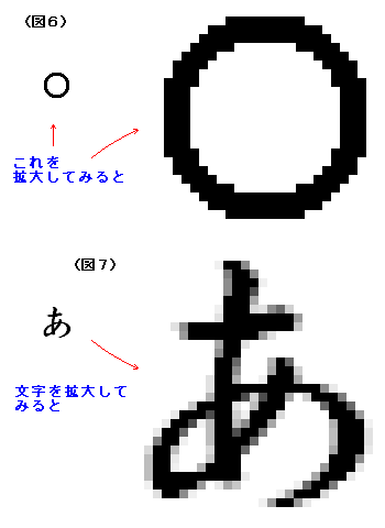 ● 選択した範囲を伸縮させる グリッドを表示する ラインを滑らかにする ● 今回は「まだ紹介していなかった技」をやってみます。 ペイントを起動しましょう。 1)選択した範囲を伸縮させる 2)グリッドを表示する 3)ラインを滑らかにする 以上の三つです。 1)選択した範囲を伸縮させる まず、選択した範囲を伸縮させるということですが、例をあげてやってみま す。まず、すべて塗りつぶす円を描いてみましょう。 左側のツールボックスから「楕円」を選択し、塗りつぶしのスタイルは三つ あるうちの一番下を選び、カラーボックスで、好みの色を選択します。 「 Shift 」キーを押しながら、斜めにドラッグして、真ん丸を描きます。 (図1) ★画像説明(ここをクリック)★ 左側のツールボックスから「選択」を選び、描いた円の一部分(例では円の 上部)を斜めにドラッグして範囲選択します。(図2) 青い枠線の四隅と、縦横の中間にある■の部分のいずれかに、マウスポイン タを当てると、矢印に変わります。(うまく合わせるのがとても難しいです) ちなみに(図2)のA地点にマウスポインタを当ててみましょう。上下の矢 印になるようにやってみてください。(四方←↑↓→に向いている矢印は違い ます。上下です、上下。↑↓) 上下の矢印に変わったら、それをドラッグで上に押し上げると、(図3)に なり、下に押し下げると(図4)になります。 あれ?タマゴの形はこうして描けばよかったのですね。 しかし細い線でやってみると、縮めた場合では線の一部が途切れてしまいま した。(図5)これではいけませんね。 どちらにしろ、ペイントでの伸縮機能は、ラインの滑らかさがなくなってし まうことが欠点のようです。 2)グリッドを表示する グリッドとは? ・・格子のことです。 キャンバス上に、グリッド(格子)を表示させる方法です。 設計やグラフなどを書く時に使う「方眼紙」というものがありますよね。グ リッドとはそれと同じようなものです。 きれいに整列させたい時や、細かい作業(ドット絵を描くときなど)を行う 時には、使ってみるといいかもしれませんね。 ★画像説明(ここをクリック)★ (1) 左側のツールボックスから、むしめがねの絵のアイコン「拡大と縮小」 をクリックします。 (2) その下で、倍率を選択しますが、「1×」と「2×」では出来ません。 「6×」か「8×」を選んでください。 (3) 上に並んだメニューから「表示(V)」をクリックし、現れた中から「拡大 (Z)」にポインタを合わせ、さらに現れたメニューから「グリッドを表示(G)」 をクリックします。 グリッドを消すには、先ほどの"グリッドを表示する方法"と同じ操作を行い、 「レ グリッドを表示(G)」をクリックして「 レ 」点を消せば、元に戻ります。 3)ラインを滑らかにする ペイントは、小さな点(ドット)が集まって、線や絵を描いています。 縦や横のまっすぐな線ではギザギザにはなりませんが、曲線や斜めの線では、 よく見るとギザギザになっているのが分かります。(図6) ★画像説明(ここをクリック)★ 「テキスト」を使って文字を書いた場合の、拡大させたものが(図7)です。 曲線を滑らかにする方法が使われています。これを「アンチエイリアス」と 呼びます。拡大すると変ですが、このように階調をつけることによって、曲線 が滑らかに見えるのですね。 でも、この方法を使いなさい、といわれても、ペイントには自動的に絵をこ のようにする機能は付いていません。 残念ながら拡大して根気よく、ドットを一つずつクリックしていくしかない ようですね。 色の濃い、薄いを使って、がんばってやってください、ということになりま す。(^_^;) |