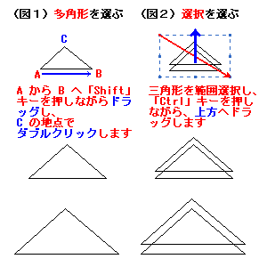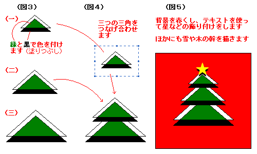 ● クリスマスの絵を描く〜「ツリー」を描く(1) ● 今回はこんな絵をやってみます。 ↓ ★画像説明(ここをクリック)★ ペイントを起動します。 キャンバスのサイズはご自由に設定してください。(例では 300×300 ピク セルです) 「 Ctrl 」+「 E 」キーを押すか、メニューの「変形(I)」→「キャンバス の色とサイズ(A)」で設定します。 クリスマスツリーでイメージする形といえば、三角形を重ねたような形です ね。ということで、 1)三角形を三つ描きます。 多角形を描く方法は、Vol.12 で紹介しています。 ↓ ★画像説明(ここをクリック)★ 左側のツールボックスより、「多角形」を選択します。 では、次の画像説明を参考に、三つの三角形を描いてください。大きさは、 大、中、小と、大きさを変えます。 「 Shift 」キーを使うことによって、水平線がかけます。(図1) ★画像説明(ここをクリック)★ 「 Shift 」キーを押しながら(水平線がかけます)A から B までドラッグ し、その後 C の地点でダブルクリックさせます。 これで三角形が描けましたね。(図1) 2)三角形をダブらせます。(図2) 普通にツリーを描くならこの方法は必要はありませんが、少し工夫してみま しょう。(^^ゞ 左側のツールボックスから「選択」を選んで、その下で「背景を透明にする」 ほうを選びます。 三角形をドラッグで範囲選択し、できた青い枠線の中にマウスポインタをも ってきて、「 Ctrl 」キーを押しながら、ドラッグで上方にずらせます。 (図2) 左側のツールボックスから「塗りつぶし」を選択して、緑と黒を使って三角 形の一部を塗りつぶします。(図3) ★画像説明(ここをクリック)★ 3)三つの三角形をつなぎ合わせます。(図4) 左側のツールボックスから「選択」を選んで、その下で「背景を透明にする」 ほうを選びます。 (二)の三角形をドラッグで範囲選択し、それを(三)の三角形の上にドラ ッグして重ねます。 さらに(一)の三角形を範囲選択して(二)の三角形の上にドラッグして重 ねます。 一応、ツリーの形が出来上がりました。 木の幹の部分を、左側のツールボックスから「四角形」を選んで、斜めにド ラッグして描きましょう。 ツリーの台も描いてもいいかもしれません。 背景は「塗りつぶし」を使って赤くします。 4)ツリーに飾り付けをします。 さて、ここからはもう、皆さんの自由です。何を書いてももかまいません。 「テキスト」を使って、ツリーに飾り付けをしましょう。 左側のツールボックスから「テキスト」と、その下で「背景を透明にする」 ほうを選び、自由に文字や記号を書きます。 「テキスト」(文字や記号、文章を書く方法)はお分かりですね。 文字を入れたい範囲をドラッグすると青い枠線が現れ、フォントや文字の大 きさ、太さなどを設定し、青い枠線の中にカーソルが点滅していなければその 中をクリックし、後はキーで文字や記号を入力します。 青い枠線の矢印に変わる部分(青い枠線の四隅と縦横の中央にある小さな■ の部分ですが、矢印の形になるように合わせるのがちょっと難しいです)をド ラッグして調整を行ってください。 日本語入力をオンにし、「ほし」と入力して変換すると、「☆」「★」や、 「☆彡」「☆ミ」という星が現れませんか? 下のカラーボックスから色を選び、黒い★と黄色い★をずらせてツリーの上 に書きます。 うまくツリーの上に乗るように、青い枠線の矢印に変わる部分を、上下、左 右にドラッグして星の位置を調整してください。 最初に現れた青い枠線よりも、小さく(狭く)することは出来ません。 枠を広げるような要領で動かしてください。(★が移動するように、枠を動 かしてください)分かりますか? 星を別の場所に書いておいて、後からドラッグで移動させてもいいでしょう。 青い枠線の外側をクリックすれば確定です。 !”#$%&=〜|’@‘;:+*、。・¥ また、 j など、記号やアルフ ァベットを書き込みます。 フォントサイズや太さを変えて試してみましょう。 背景の雪は * を使いましょう。いろいろ大きさを変えれば、雪に遠近感が 出ます。 ブラシや、エアブラシをチョン、とクリックして作る雪もいいですね。 皆さんの発想で、オリジナルの絵を完成させてみてください。 |