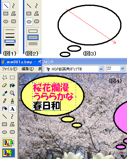 ● 画像に文字や絵を書き込む ● 皆さんはパソコンの楽しみの一つに、デジタルカメラで撮影した画像を保存 したり閲覧したり、ということもありますよね。 今回はその画像を使って楽しんでみますが、その前に、使用する画像は皆さ んの、マイピクチャなどに保存してある大切な画像を使いますので、作業の後、 間違っても上書き保存してしまわないように気をつけてください。 出来上がったら必ず別の名前をつけて保存するか、あらかじめコピーを作っ たもので試してください。 それではまず画像をペイントで開きます。 開き方は二通りあるのですが、画像を右クリックしてメニューから「プログ ラムから開く」→「 Paint 」を選ぶか、「ペイント」を先に立ち上げてからフ ァイルメニューより「開く」で、目的の画像を探して開く、のどちらかで開き ます。 ここで、画像がとても大きすぎる場合は縮小しておきましょう。 キーボードショートカットの「 Ctrl 」+「 W 」(またはメニューから「変 形」→「伸縮と傾き」)。 現れた画面から「水平方向」と「垂直方向」に伸縮させる数値を入れ「 OK 」 を押します。 ともに50%なら横(水平方向)、縦(垂直方向)が半分になります。 では、ペイントで開いたこの画像の上からお絵描きをやってみます。 落書きをするように、ブラシなどを使って自由に描いてみましょう。 漫画などによくある「ふきだし」を描いてみました。 ★画像説明(ここをクリック)★ (1)線の太さは「直線」または「曲線」を選んでから、その下に現れた中 から太さを選びます。やや太めの線にしてみました。(図1) (2)「楕円」または「角丸四角形」を選び、その下で、タイプは三つある うちの真ん中を選びます。(図2) (3)斜めにドラッグして円(ふきだし)を描きます。(図3) 文字を入れます。 (4)「テキスト」を選択し、文字を入れるふきだしの部分をドラッグで選 択し、キーボードから文字を入れます。 その際、文字がうまく入るよう、文字の大きさや青い枠線の大きさを 調整してください。(図4) 青い枠線の外側をクリックして確定、出来上がりです。 ↓ ★画像説明(ここをクリック)★ 使用する画像は人物やペットがいいのでしょうが、残念ながら私の周りには 公開できる人物や、飼っているペットがいませんので、花の画像を使うことに しました。 もっともっと遊んでみたいなら、人物やペットの顔に、メガネやヒゲを付け てみたり、ハートマークを描いてみたりなど、いたずらをしてみることもでき ますね。 画像にオリジナルの額縁を描いたものと、既存の絵を貼り付けたものです。 ↓ ★画像説明(ここをクリック)★ 貼り付け方は、あらかじめ描いておいた、貼り付けたい画像をペイントで開 き、「 Ctrl 」+「 A 」ですべて選択します。 「 Ctrl 」+「 C 」でコピーします。(見た目は何も変わりません) 貼り付けるほうをアクティブにして「 Ctrl 」+「 V 」を押します。 これで現れた画像を任意の位置までドラッグし、決まれば青い枠線の外をク リックして出来上がり。 ほかにも、あなたの発想でいろいろ試してみることをお勧めします。 |