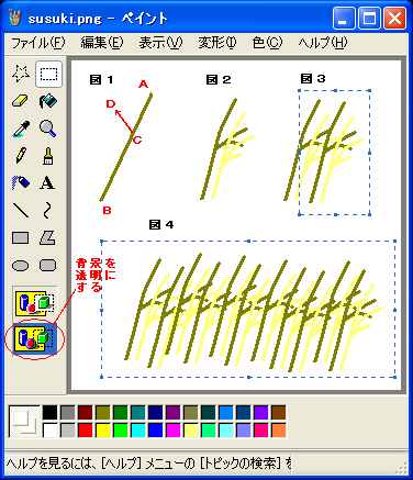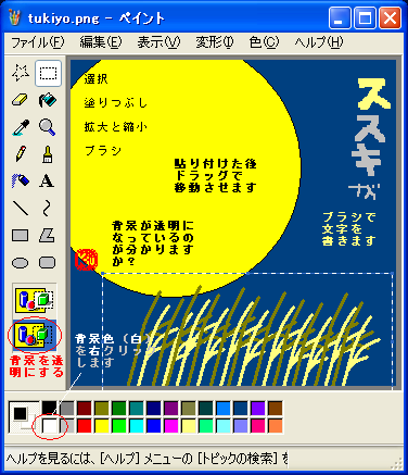 ● 絵手紙を描く〜「月とススキ」を描く ● 今回は、こんな絵を描いてみます。 ↓ ★(タイトル)月夜の晩★ ペイントを起動します。 はじめにキャンバスのサイズを設定します。 「 Ctrl + E 」キーを押すか、メニューの「変形(I)」→「キャンバスの色 とサイズ(A)」で。 大きさは自由ですが、300 × 300 ピクセルにしました。 では、画像説明といっしょに、以下の説明文を読んでください。 ★1)〜2)画像説明(ここをクリック)★ 1)夜の背景を描きます。 色はカラーボックスの上の段、右から三つ目の群青色?を選択し、左側 のツールボックスから「塗りつぶし」を選択します。 キャンバス上でクリックして、キャンバス全体をすべて塗りつぶします。 2)月を描きます。 色は黒を選択し、続いて黄色を"右クリック"します。 左側のツールボックスから「楕円」を選択します。 その下の「塗りつぶしのスタイル」は三つあるうちの真ん中(前景色で 図形を描き、その内側を背景色で塗りつぶす)を選びます。 「 Shift 」キーを押したまま、キャンバスの中からウインドウの外に向 かって(キャンバスからはみ出すまで)斜めにドラッグして、真ん丸い 月を描きます。 「 Shift 」キーを使えば、真ん丸が描けます。 月が描けたら、ここでひとまずメニューの「ファイル(F)」をクリックして、 この画像を「名前をつけて保存(A)」してください。 月の絵とは"別に"、もうひとつ、新しくペイントを起動させます。 ★3)〜5)画像説明(ここをクリック)★ 3)ススキを描きます。 色はカラーボックスの上の段、左から四つ目の金色?を選択し、左側の ツールボックスから「曲線」を選択します。 その下の線の太さを選ぶところで、真ん中の太さを選びます。 ドラッグでAからBへ斜めの線を引き、続いてCからD方向へドラッグ して引っ張り上げるように曲げます。(図1) 曲線は二か所を曲げることができますが、一か所を曲げるだけでいい場 合は、一か所目を曲げた時点でその場でクリックさせます。 この要領でススキの穂を描いていきます。 4)色を変えてもうひとつ、その手前にススキを描きます。 色はカラーボックスの下の段、右から六つ目の薄い黄色を選択します。 先ほどと同じ要領で、曲線を使ってススキの穂を描きます。(図2) 5)描いたススキをたくさんコピーします。 ツールボックスから「選択」を選びます。 その下のほうにある塗りつぶしのスタイルは「背景を透明にする」ほう を選んでください。 描いたススキを、ドラッグで範囲選択します。 青い枠線で囲んだら、それを「 Ctrl 」キーを押したままドラッグで少 しずらして移動させます。 マウスの左ボタンを離しても、ずらして出来たほうにはまだ青い枠があ りますから、(図3)さらに同じ操作を繰り返して、どんどんススキを コピーしていきます。こうしてたくさんのススキを作ります。 できたら青い枠線の外側をクリックします。 6)できたススキをコピーし、月の絵に貼り付けます。 たくさんできたススキの絵の全体を、ドラッグして範囲選択します。 (図4) 「 Ctrl 」キーを押しながら「 C 」キーを押し、コピーします。(メニ ューからは「編集(E)」→「コピー(C)」)(画面上は何も変わりません) ★6)〜9)画像説明(ここをクリック)★ はじめに描いた月の絵のほうをアクティブにし、「 Ctrl 」キーを押し ながら「 V 」キーを押し、貼り付けます。(メニューからは「編集(E)」 →「貼り付け(P)」) *ここでもしも貼り付けたススキの背景が透明になっていなければ、ツー ルボックスの下のほうで「背景を透明にする」ほうをクリックして、そ れでもまだ透明にならなければ、続いてカラーボックスの白を"右クリッ ク"してください。これで背景が透明になります。 ドラッグでススキを移動させ、位置が決まれば青い枠線の外側をクリッ クします。(図5) 7)文章を書きます。 左側のツールボックスから、「ブラシ」を選択します。 その下の方にあるブラシのサイズは中と小の■で書いてみます。(●で もいいですが、■のほうが面白い字体になります) 色は背景に合わせて、薄いグレーと濃いグレー、ちょっとカラフルにほ かの色も使ってみます。 ドラッグして書いてみましょう。 うまくいかなかったら「 Ctrl 」+「 Z 」で三つ前の操作までやり直し ができます。 上手に書けなくてもかまいません。上手に書かないほうが、絵手紙の特 徴や味が出ますよ。 8)作っておいた「はんこ」を貼り付けて完成。 以前に作っておいた「はんこ」(落款)をペイントで開きます。 左側のツールボックスから「選択」を選びます。 はんこの部分をドラッグして範囲選択します。 「 Ctrl 」キーを押しながら「 C 」キーを押し、コピーします。(メニ ューからは「編集(E)」→「コピー(C)」)(画面上は何も変わりません) 完成間近の月の絵のほうをアクティブにし、「 Ctrl 」キーを押しなが ら「 V 」キーを押し、貼り付けます。(メニューからは「編集(E)」→ 「貼り付け(P)」) ここでもしも背景が透明になっていないなら、背