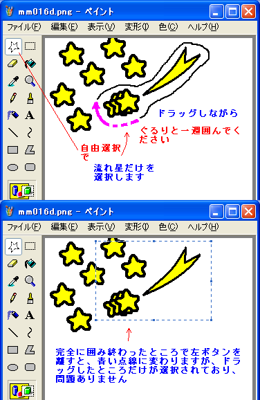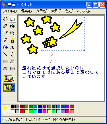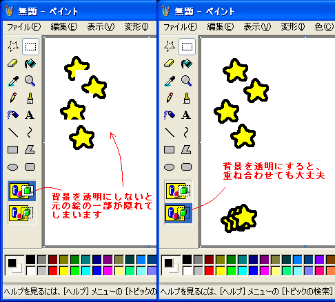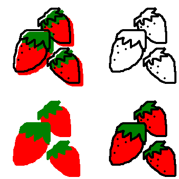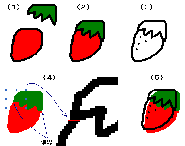 ● イチゴの絵を描く ● 私は先日イチゴ狩りに行ってきました。ということで、イチゴの絵を描いて みることにします。 イチゴの絵は簡単です。逆三角形に、葉っぱの帽子をかぶせ、粒々を付けれ ば出来上がりですから。 今回の作品はこちら。★(タイトル)章姫(あきひめ)★ ペイントを起動します。 ブログなどにアップするなら、キャンバスの大きさは、大き過ぎないほうが いいでしょう。 今回はブラシを使ってフリーハンドで描いてみました。 ★画像説明(ここをクリック)★ 逆三角形のイチゴと葉っぱを別々に描いて、それぞれ内側を赤と緑で塗りつ ぶします。(図1) 「自由選択」の「背景は透明」で葉っぱをマウスの左ボタンを押したままぐる りと囲み、その選択部分(青い点線の枠)をドラッグで移動させます。(図2) できたイチゴをコピーして、もう一つ作ります。 コピーの方法は「選択」を選んでドラッグで範囲を選択し、できた青い点線 の枠内を「 Ctrl 」キーを押しながらドラッグします。 そのコピーしたイチゴを「白」で内側を塗りつぶし、粒々を描き加えたもの が(図3)です。 色のない「線だけのイチゴ」ができましたね。 では、もう一つのイチゴを「色だけのイチゴ」にします。(図4) 輪郭の線を赤と緑に塗りつぶすわけですが、一部分、拡大したところを見て ください。 あらかじめ、緑との境界を「鉛筆」などで赤く区切っておいてから塗りつぶ してください。 これで「色だけのイチゴ」と、「線だけのイチゴ」ができました。 あとは「線だけのイチゴ」を「選択」して、ドラッグで「色だけのイチゴ」 の上に移動させます。 このとき、ちょっとだけずらすのがミソです。(図5) 説明の画像ではイチゴが一つだけですが、一つでは少しさびしい気がします ので、複数描いたほうがいいでしょう。 ★画像説明(ここをクリック)★ あらかじめ描いておいた背景の上にイチゴを貼り付けたり、文字を入れたり してみてください。 その文字も色を変えて二重にすると面白くなります。 今回は選択して、それをコピーや移動するという方法が出てきましたので、 復習に過去の画像と作品を見てみましょう。 ★*復習〜(ここをクリック)★ 〜 ★*復習〜(ここをクリック)★ ★*復習〜(ここをクリック)★ 〜 ★*復習〜(ここをクリック)★ ★(タイトル)星降る夜に★ 今回は描き方を工夫してみましたが、いかがでしたでしょうか。 |