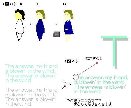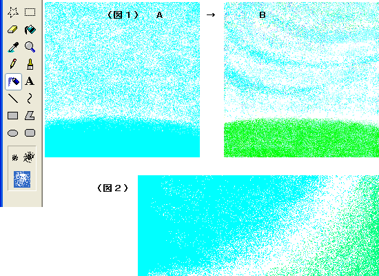 ● エアブラシで描いてみよう(2) ● 今回の作品はこちら。★(タイトル)風に吹かれて♪★ ということで、早速、描いてみましょう。 ペイントを起動したら、はじめに「塗りつぶし」を使ってキャンバス全体を 水色で塗りつぶしておいてください。 次に「エアブラシ」、その下のエアブラシの大きさは大きいものを選びます。 色は「白」を選び、ササッ、と吹き付けて、雲や風の雰囲気を描いていきま す。(図1) ★画像説明(ここをクリック)★ A から B は(画像は多少縮小していますが)実際の工程途中の画像です。 グラデーションの効果を使えばきれいになります。(図2) エアブラシを吹き付ける技は少々難しく感じるかもしれませんが、実は私も 一回で仕上げているわけではなくて、何度も何度も塗り重ねて、修正を繰り返 しながら仕上げているのですよ。 根気よく、納得がいくまで水色と白を繰り返し吹き付け、塗り重ねていって ください。 さて、こうして空や草原を描いたら、そこに人物を描いてみましょう。 といっても人物は草原の上に直接描くのではなくて、もう一つ別にペイント を起動して、そこに描いたもの(ここでは人物や文字)をコピーし、草原のほ うの絵があるペイントに貼り付ける、という方法をとりました。 人物は小さいので、細かいところまでうまく描けるように「拡大」を使って 描いてください。 ★画像説明(ここをクリック)★ (図3)A B C は実際の工程途中の画像です。 大まかに描いたものから順に修正を加えて仕上げていきます。 かばんなどの持ち物は(たとえばこの画像にはありませんが、帽子やアクセ サリー類なども)C のように体から離したところで描いて、あとドラッグで移 動させる方法をとるといいと思います。 かばんが描けたら左のツールから「選択」を選び、「背景を透明」にし、か ばん全体を斜めにドラッグして青い枠で囲みます。 囲んだ青い枠の内側を、ドラッグで少女の手元まで移動します。 位置が決まれば、青い枠の外をクリックします。 次に文字を入れてみましょう。 文字も先ほどの少女の絵と同じく、別のペイントに書いたものをあとから貼 り付ける、という方法で。 文字と背景を、同じような色にすると読みづらくなってしまいますね。 そのような場合には、文字に影を入れると多少読みやすくなります。 (図4)を見てください。 グレーで書いた文字と薄い緑で書いた文字。この二つを少しずらして張り合 わせてみました。これで影のある文字ができる、というわけです。 *復習〜 「選択」について 「選択」したら、その部分をコピーしたり、切り取ったり、移動したり、ま た、Delete(削除)したりすることができます。 コピーや移動を大いに使えば、パソコンでのお絵描きの幅が、ずいぶん広が りますよ。 |